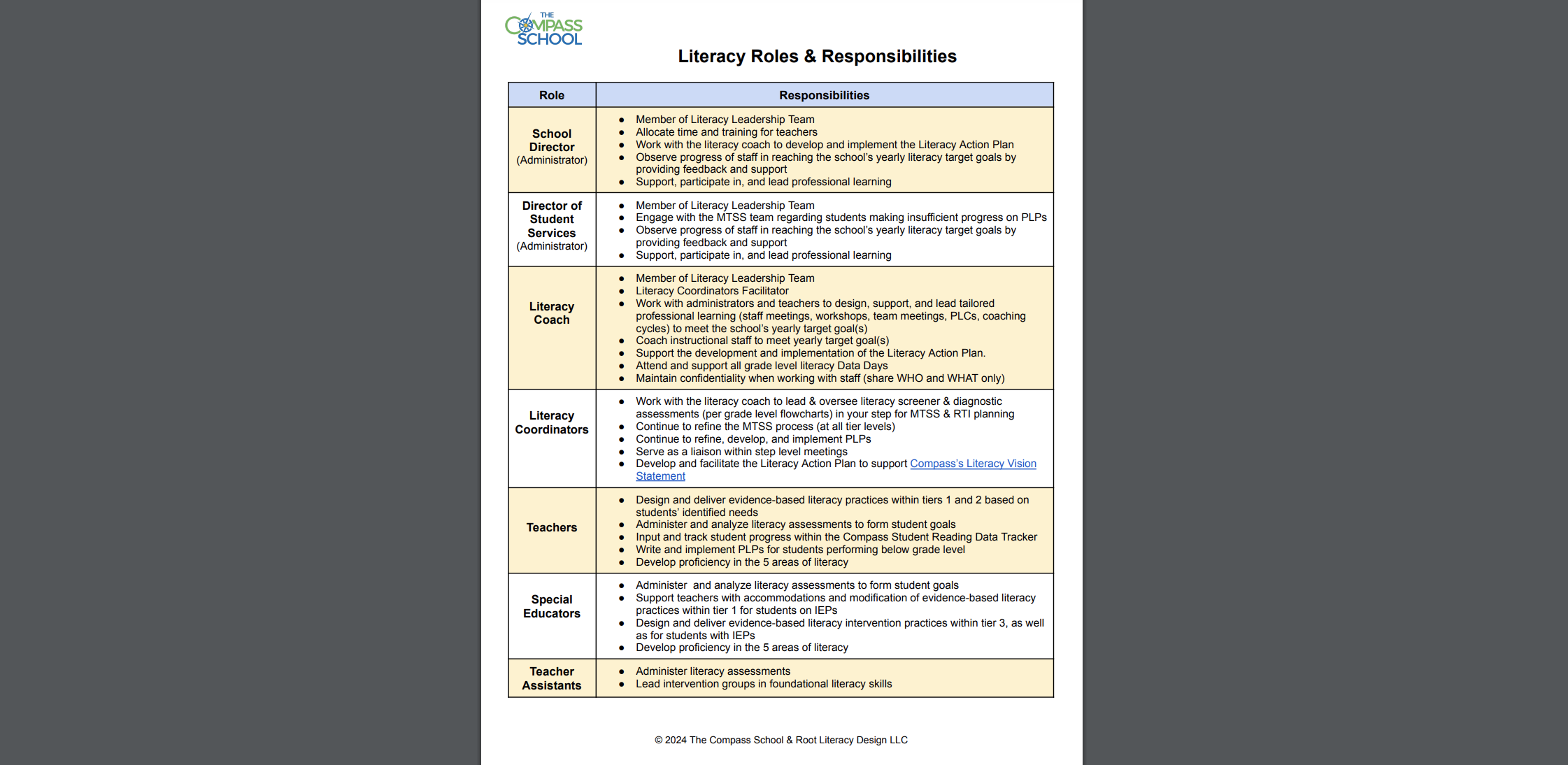 Below are some strategies that one high performing school, The Compass School, has adopted in their “all hands on deck” approach to literacy transformation: